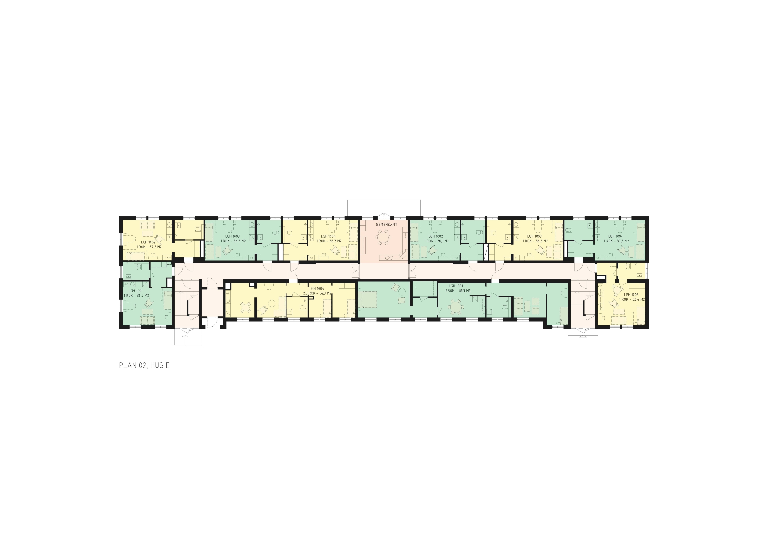 Lägenheter: En-rummare till tre-rummare, mestadels små lägenheter. Mellan 33 kvm och 88 kvm.