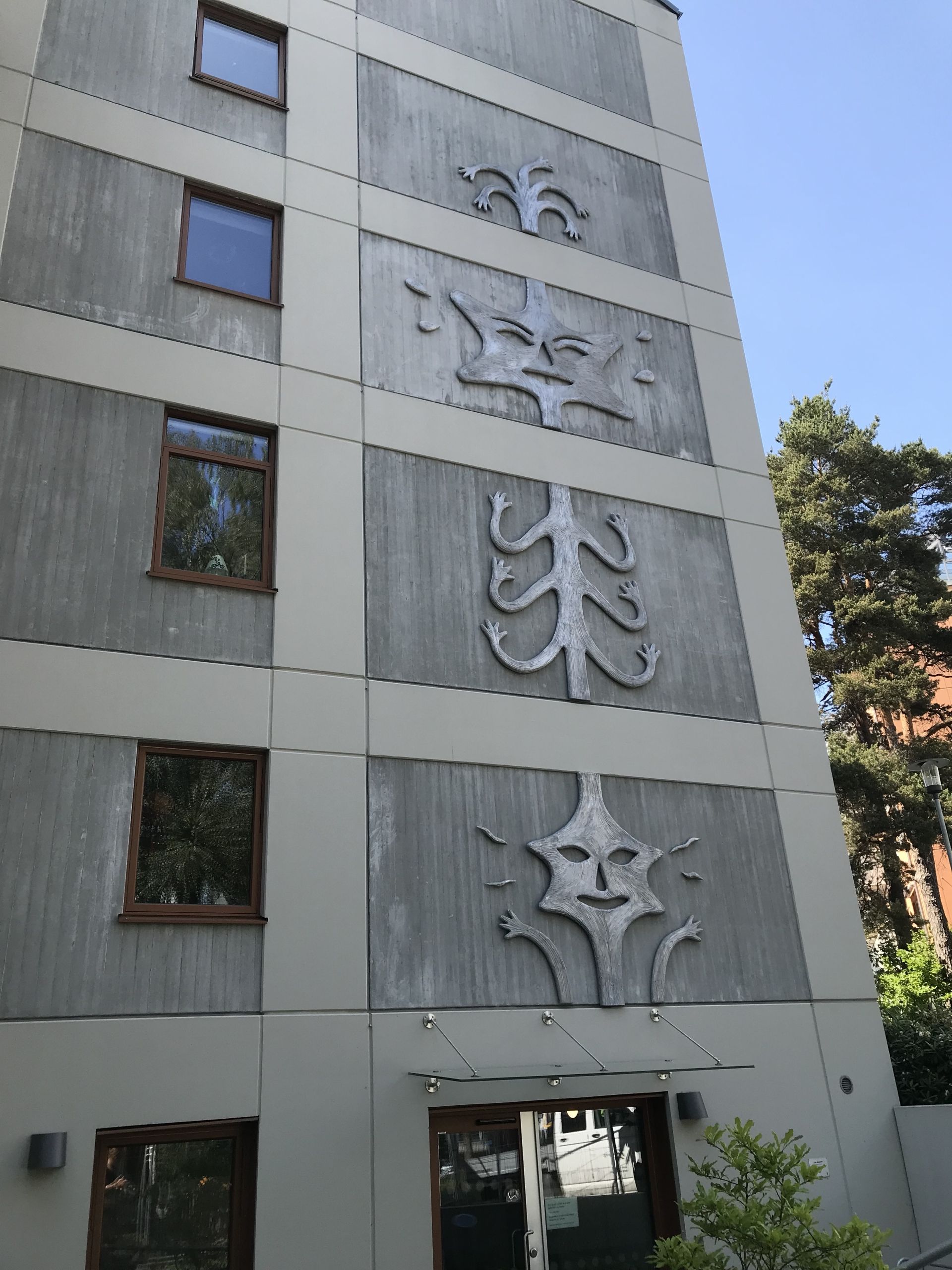 Rubelgatan – Fasadkonstverk i aluminium av Lisa Jonasson. ”Växande varelse” har ett slags stamform – både växt och varelse. Skulpturfiguren rör sig mellan växt, varelse, totempåle och träd.